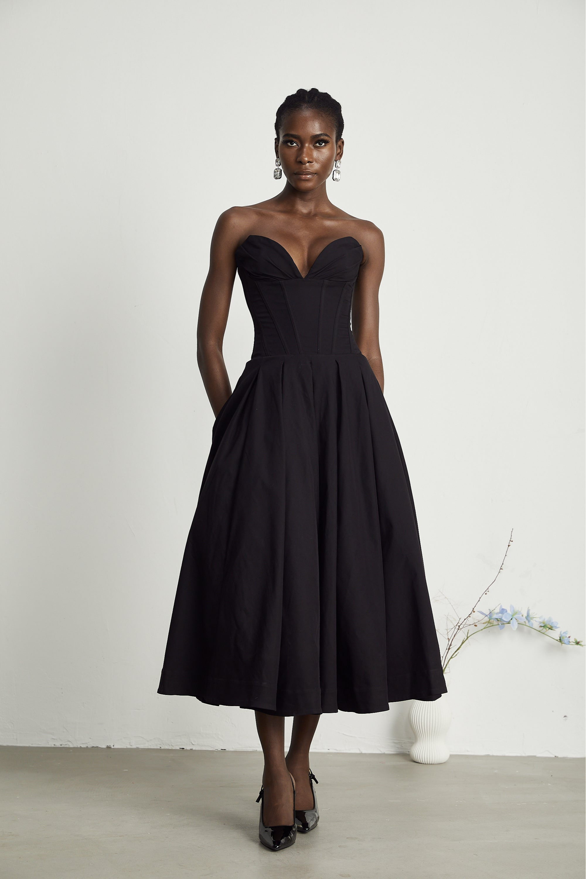 The Eliana Sleek Off-Shoulder Corset Midi Dress is made for women who embrace both modern style and classic elegance. Whether paired with statement jewelry and heels or kept minimal and refined, it promises a look that’s unforgettable.
