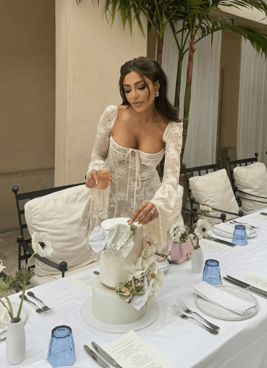 Romantic and effortlessly feminine, Lisandre is designed to capture soft elegance with modern charm. Featuring delicate sheer lace, a fitted corset-inspired bodice, flared statement sleeves, and a gently ruffled mini hem, this dress balances structure with graceful movement. Perfect for garden parties, brunches, or evening celebrations, Lisandre ensures you look polished and enchanting.